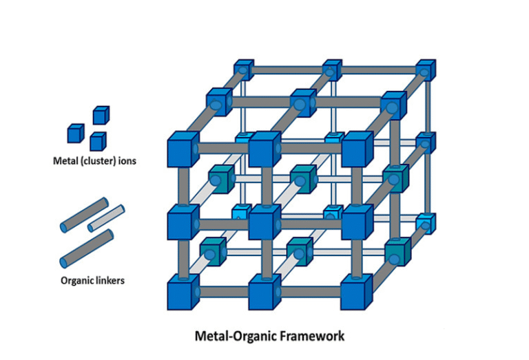 Figure 1. Schematic representation of the three-dimensional arrangement of metal-organic frameworks (MOFs), highlighting the coordination between metal nodes and organic linkers that defines their composition.