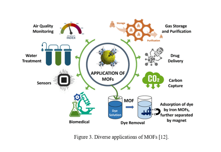 Their exceptional porosity and chemical versatility make MOFs promising for diverse applications, including CO₂ capture, water harvesting, gas storage, catalysis, molecular separation, sensing, energy storage, drug delivery, and environmental remediation (Figure 3) [10], [11].