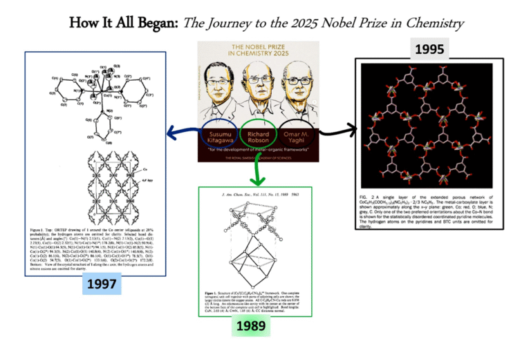 After highlighting the century-long evolution of chemistry and the Nobel Prize’s role in recognizing transformative discoveries, the discussion naturally leads to the latest milestone: Metal–Organic Frameworks (MOFs). This year’s Nobel Prize in Chemistry honors Susumu Kitagawa (Kyoto University, Japan), Richard Robson (University of Melbourne, Australia), and Omar M. Yaghi (University of California, Berkeley, USA) for the development of metal–organic frameworks (MOFs).